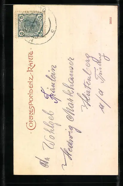 Personenbezogene Daten auf der Rückseite der Karte wurden durch blauen Textmarker unkenntlich gemacht. Die blauen Stellen sind auf die Vorderseite durchgeweicht und wirken sich negativ auf das Postkartenfoto aus