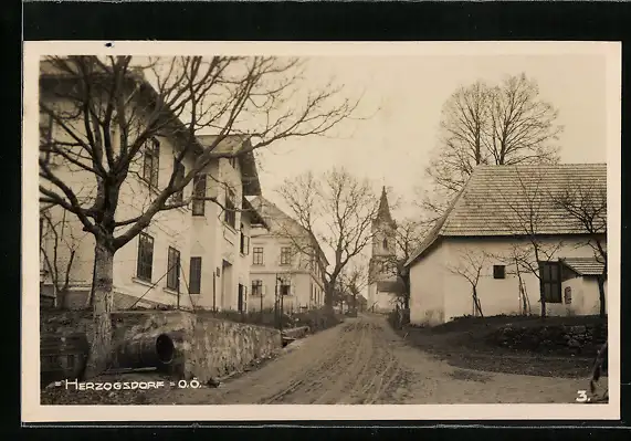 AK Herzogsdorf /O. Ö., Kirche mit Strassenpartie