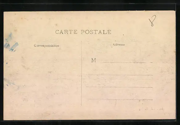 Personenbezogene Daten auf der Rückseite der Karte wurden durch blauen Textmarker unkenntlich gemacht. Die blauen Stellen sind auf die Vorderseite durchgeweicht und wirken sich negativ auf das Postkartenfoto aus