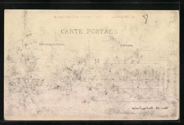 Personenbezogene Daten auf der Rückseite der Karte wurden durch blauen Textmarker unkenntlich gemacht. Die blauen Stellen sind auf die Vorderseite durchgeweicht und wirken sich negativ auf das Postkartenfoto aus