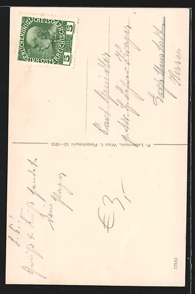 Personenbezogene Daten auf der Rückseite der Karte wurden durch blauen Textmarker unkenntlich gemacht. Die blauen Stellen sind auf die Vorderseite durchgeweicht und wirken sich negativ auf das Postkartenfoto aus
