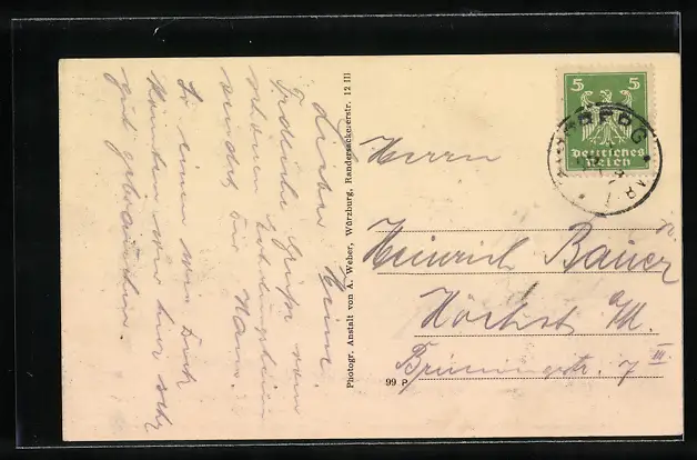 Personenbezogene Daten auf der Rückseite der Karte wurden durch blauen Textmarker unkenntlich gemacht. Die blauen Stellen sind auf die Vorderseite durchgeweicht und wirken sich negativ auf das Postkartenfoto aus