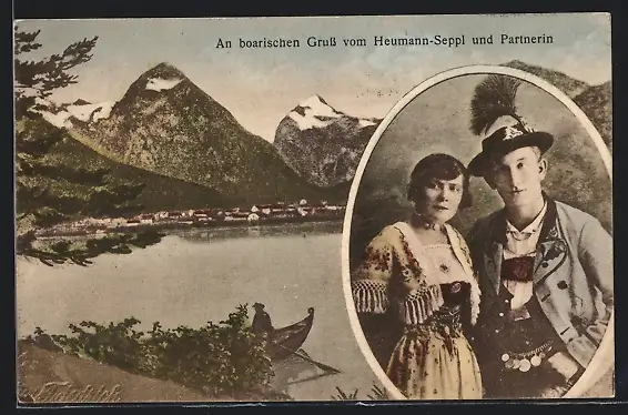 AK Heumann-Seppl und Partnerin, Uferlandschaft mit Boot
