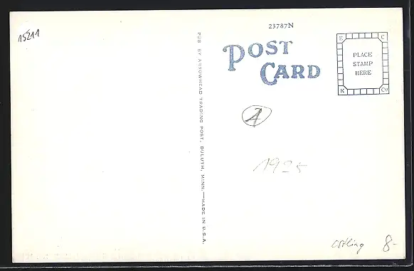 Personenbezogene Daten auf der Rückseite der Karte wurden durch blauen Textmarker unkenntlich gemacht. Die blauen Stellen sind auf die Vorderseite durchgeweicht und wirken sich negativ auf das Postkartenfoto aus