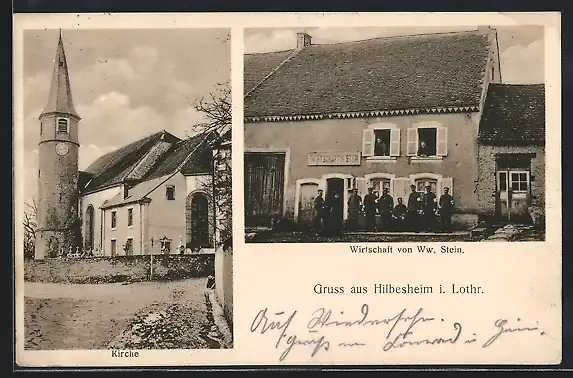 AK Hilbesheim i. Lothr., Gasthaus v. Ww. Stein, die Kirche