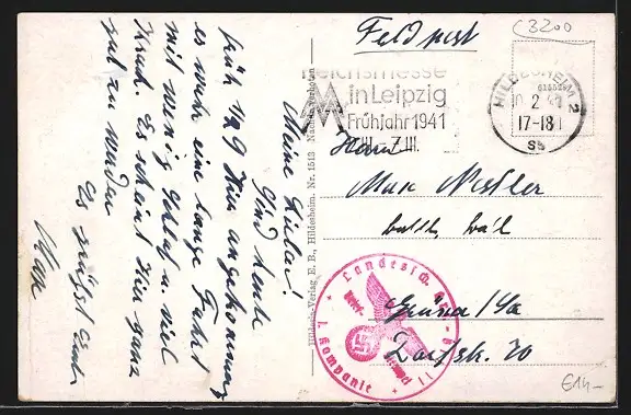 Personenbezogene Daten auf der Rückseite der Karte wurden durch blauen Textmarker unkenntlich gemacht. Die blauen Stellen sind auf die Vorderseite durchgeweicht und wirken sich negativ auf das Postkartenfoto aus