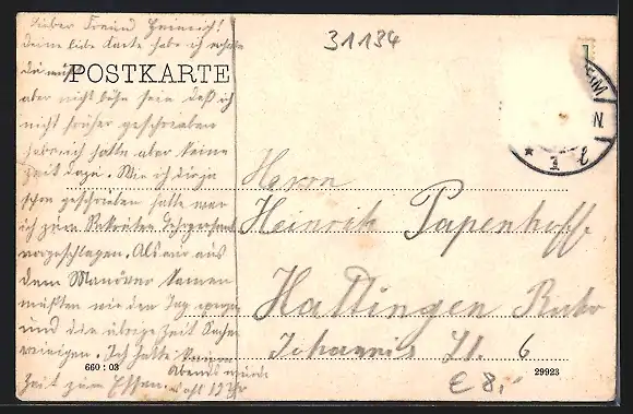 alte Ansichtskarte, gelaufen, Briefmarke entfernt, rückseitig Oberflächenschaden, guter Zustand