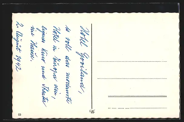 Personenbezogene Daten auf der Rückseite der Karte wurden durch blauen Textmarker unkenntlich gemacht. Die blauen Stellen sind auf die Vorderseite durchgeweicht und wirken sich negativ auf das Postkartenfoto aus