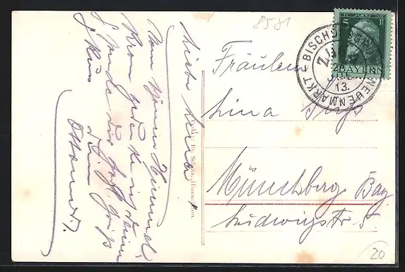 Personenbezogene Daten auf der Rückseite der Karte wurden durch blauen Textmarker unkenntlich gemacht. Die blauen Stellen sind auf die Vorderseite durchgeweicht und wirken sich negativ auf das Postkartenfoto aus