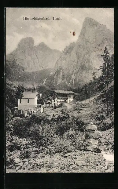 AK Hinterbärenbad, Ortspartie mit Pfarrkirche und Kaisergebirge