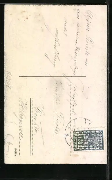 Personenbezogene Daten auf der Rückseite der Karte wurden durch blauen Textmarker unkenntlich gemacht. Die blauen Stellen sind auf die Vorderseite durchgeweicht und wirken sich negativ auf das Postkartenfoto aus
