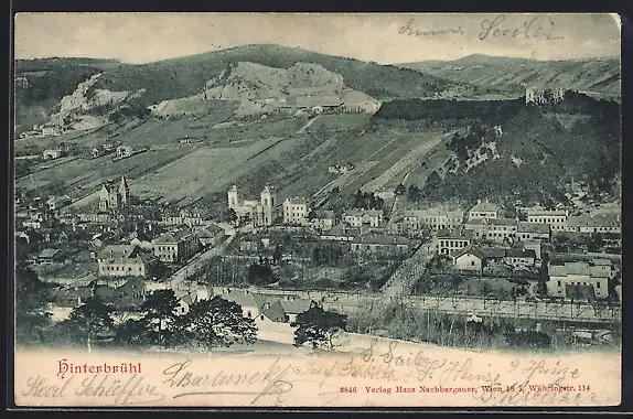 AK Hinterbrühl, Ortsansicht mit Bergen aus der Vogelschau