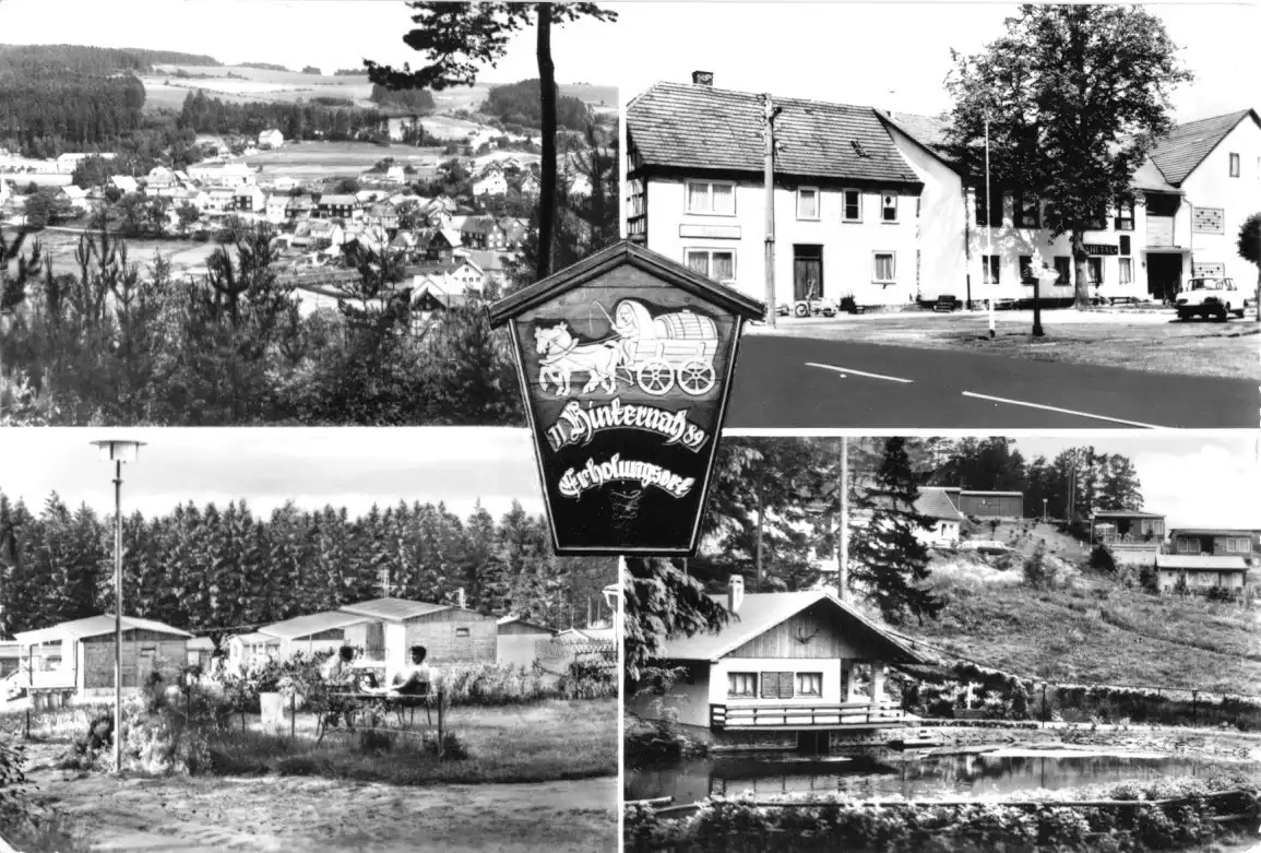 Ansichtskarte Hinternah Thür. vier Abb., - Teilansicht, Erholungsheim Nahetal, Bungalow-Anlage, Kohlbach Erhaltung I-II postalisch gelaufen, gestempelt: unleserlich Druckvermerk: 1987 Herstellungsland: DDR Verlag: Straub & Fischer, Meiningen
