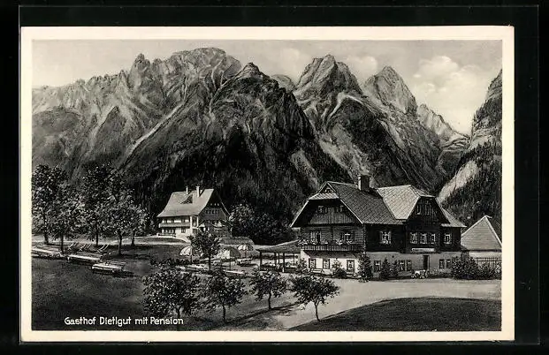 AK Hinterstoder, Gasthof Dietlgut mit Strasse und Bergpanorama