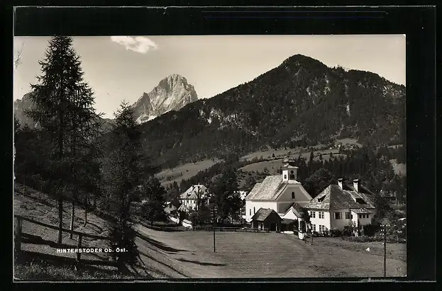 AK Hinterstoder /O. Oe., Teilansicht mit Kirche gegen Berggipfel