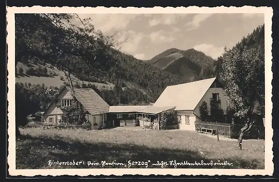 AK Hinterstoder, Pension Herzog mit bewaldeten Hügeln im Hintergrund