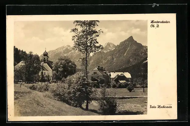 AK Hinterstoder, Teilansicht mit Kirche und Bergen