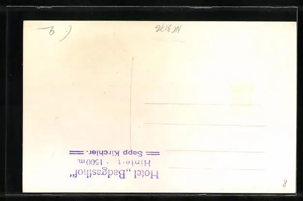 Personenbezogene Daten auf der Rückseite der Karte wurden durch blauen Textmarker unkenntlich gemacht. Die blauen Stellen sind auf die Vorderseite durchgeweicht und wirken sich negativ auf das Postkartenfoto aus