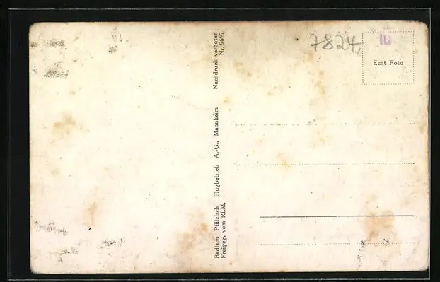Personenbezogene Daten auf der Rückseite der Karte wurden durch blauen Textmarker unkenntlich gemacht. Die blauen Stellen sind auf die Vorderseite durchgeweicht und wirken sich negativ auf das Postkartenfoto aus
