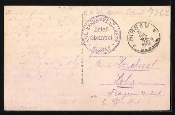 Personenbezogene Daten auf der Rückseite der Karte wurden durch blauen Textmarker unkenntlich gemacht. Die blauen Stellen sind auf die Vorderseite durchgeweicht und wirken sich negativ auf das Postkartenfoto aus
