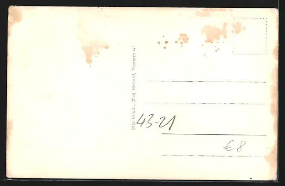 Personenbezogene Daten auf der Rückseite der Karte wurden durch blauen Textmarker unkenntlich gemacht. Die blauen Stellen sind auf die Vorderseite durchgeweicht und wirken sich negativ auf das Postkartenfoto aus