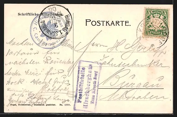 Personenbezogene Daten auf der Rückseite der Karte wurden durch blauen Textmarker unkenntlich gemacht. Die blauen Stellen sind auf die Vorderseite durchgeweicht und wirken sich negativ auf das Postkartenfoto aus