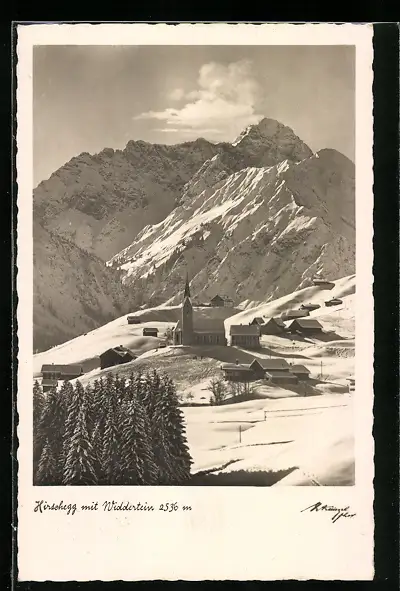 AK Hirschegg, Ortsansicht mit Widderstein im Winter