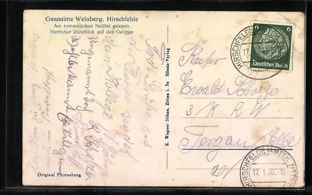 alte Ansichtskarte, gelaufen 1938, Eckknick und Bugspur li. oben, guter Zustand