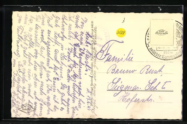 Personenbezogene Daten auf der Rückseite der Karte wurden durch blauen Textmarker unkenntlich gemacht. Die blauen Stellen sind auf die Vorderseite durchgeweicht und wirken sich negativ auf das Postkartenfoto aus