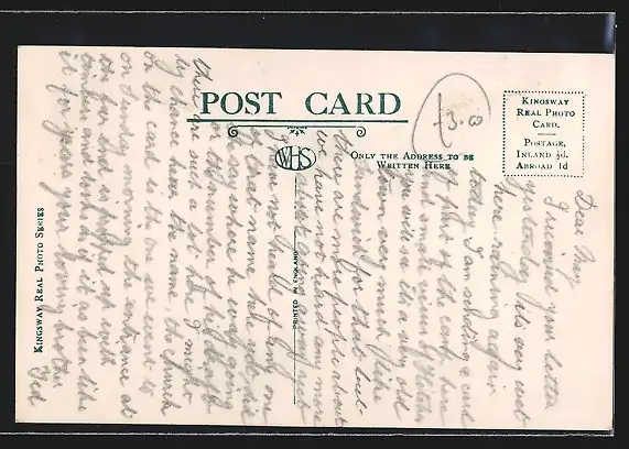 Personenbezogene Daten auf der Rückseite der Karte wurden durch blauen Textmarker unkenntlich gemacht. Die blauen Stellen sind auf die Vorderseite durchgeweicht und wirken sich negativ auf das Postkartenfoto aus