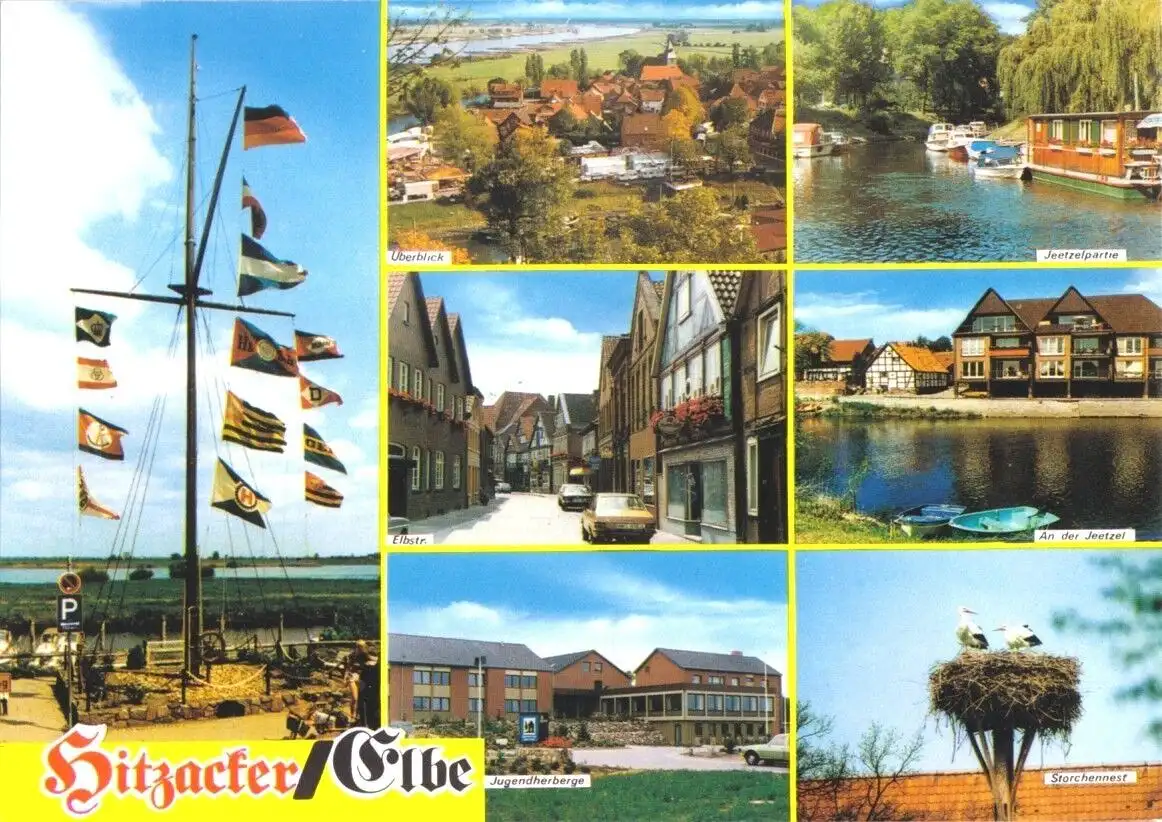Ansichtskarte Hitzacker Elbe sieben Abb., u.a. Jeetzelpartie, Elbstr., Jugendherberge, Storchennest Erhaltung I-II ungenaufen, um 1986 Verlag: Ferd. Lagerbauer, 2000 Hamburg 60