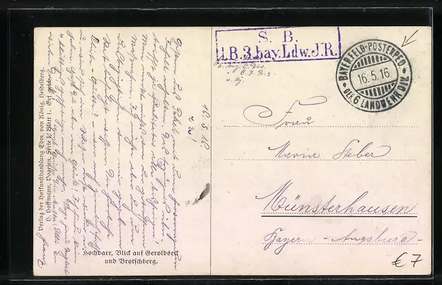 Personenbezogene Daten auf der Rückseite der Karte wurden durch blauen Textmarker unkenntlich gemacht. Die blauen Stellen sind auf die Vorderseite durchgeweicht und wirken sich negativ auf das Postkartenfoto aus