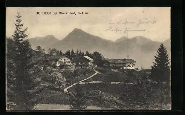 AK Hocheck, Gasthaus vor dem Gebirgspanorama