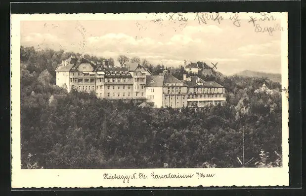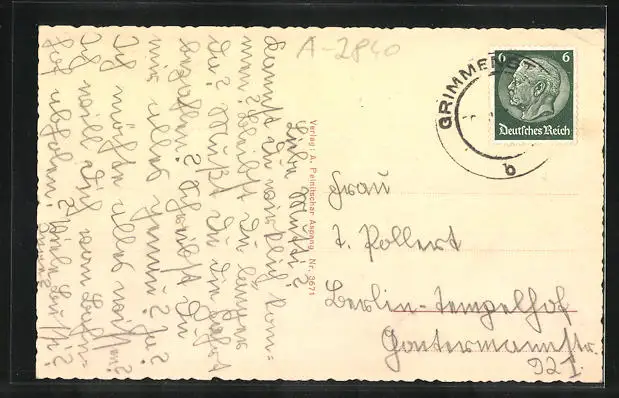 Personenbezogene Daten auf der Rückseite der Karte wurden durch blauen Textmarker unkenntlich gemacht. Die blauen Stellen sind auf die Vorderseite durchgeweicht und wirken sich negativ auf das Postkartenfoto aus