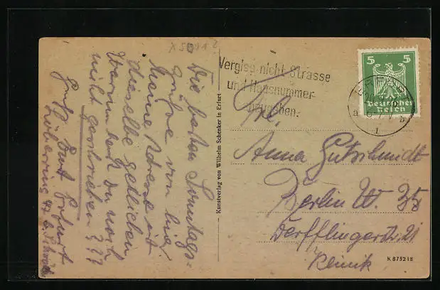 Personenbezogene Daten auf der Rückseite der Karte wurden durch blauen Textmarker unkenntlich gemacht. Die blauen Stellen sind auf die Vorderseite durchgeweicht und wirken sich negativ auf das Postkartenfoto aus