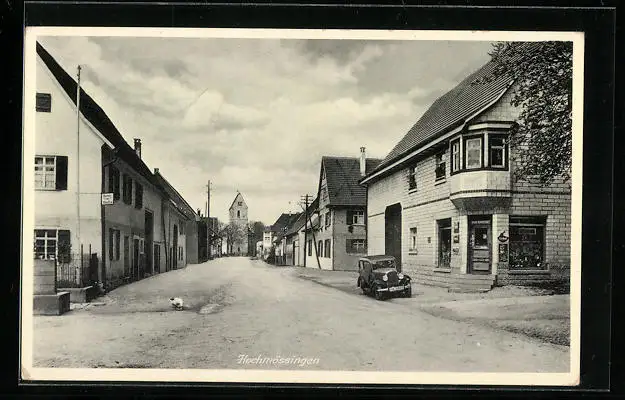 AK Hochmössingen, Strassenpartie mit Automobil und Kirche