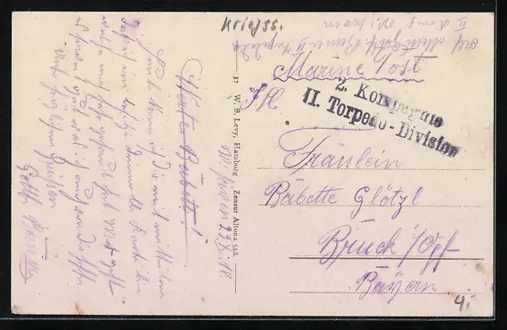 Personenbezogene Daten auf der Rückseite der Karte wurden durch blauen Textmarker unkenntlich gemacht. Die blauen Stellen sind auf die Vorderseite durchgeweicht und wirken sich negativ auf das Postkartenfoto aus