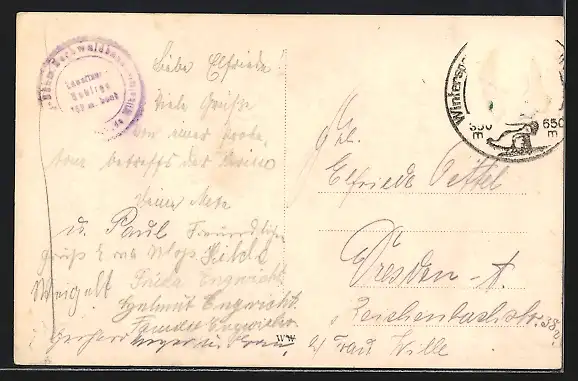 Personenbezogene Daten auf der Rückseite der Karte wurden durch blauen Textmarker unkenntlich gemacht. Die blauen Stellen sind auf die Vorderseite durchgeweicht und wirken sich negativ auf das Postkartenfoto aus