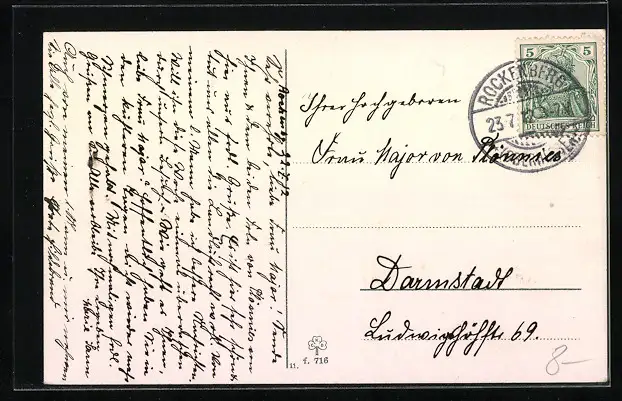 Personenbezogene Daten auf der Rückseite der Karte wurden durch blauen Textmarker unkenntlich gemacht. Die blauen Stellen sind auf die Vorderseite durchgeweicht und wirken sich negativ auf das Postkartenfoto aus