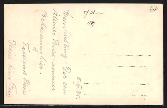 Personenbezogene Daten auf der Rückseite der Karte wurden durch blauen Textmarker unkenntlich gemacht. Die blauen Stellen sind auf die Vorderseite durchgeweicht und wirken sich negativ auf das Postkartenfoto aus