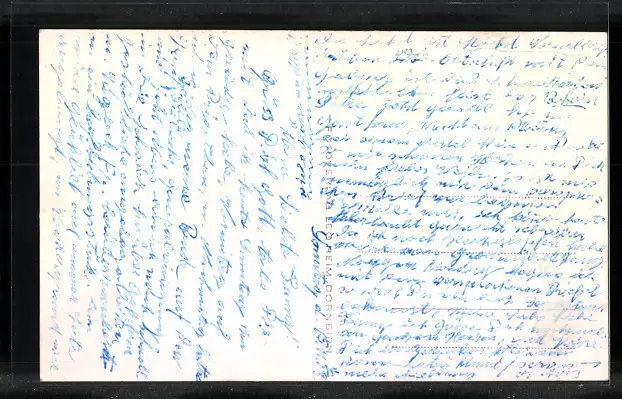 Personenbezogene Daten auf der Rückseite der Karte wurden durch blauen Textmarker unkenntlich gemacht. Die blauen Stellen sind auf die Vorderseite durchgeweicht und wirken sich negativ auf das Postkartenfoto aus