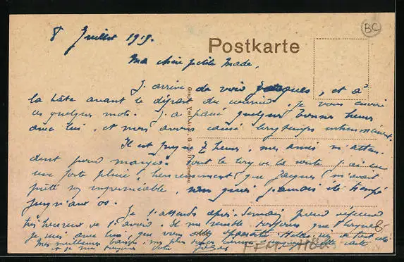 Personenbezogene Daten auf der Rückseite der Karte wurden durch blauen Textmarker unkenntlich gemacht. Die blauen Stellen sind auf die Vorderseite durchgeweicht und wirken sich negativ auf das Postkartenfoto aus