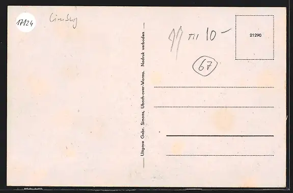 Personenbezogene Daten auf der Rückseite der Karte wurden durch blauen Textmarker unkenntlich gemacht. Die blauen Stellen sind auf die Vorderseite durchgeweicht und wirken sich negativ auf das Postkartenfoto aus