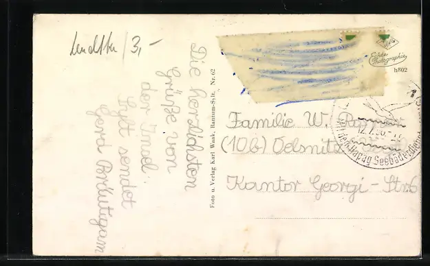 alte Ansichtskarte, gelaufen, Briefmarke entfernt, rückseitig Klebe- und Papierreste, guter Zustand