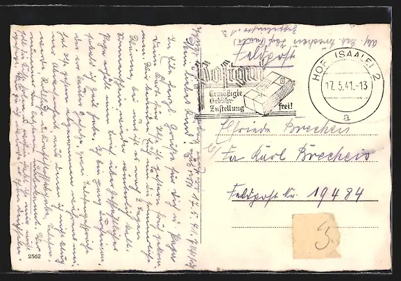 alte Ansichtskarte, gelaufen 1941, rückseitig Klebe- und Papierreste, Eckknick unten rechts, guter Zustand