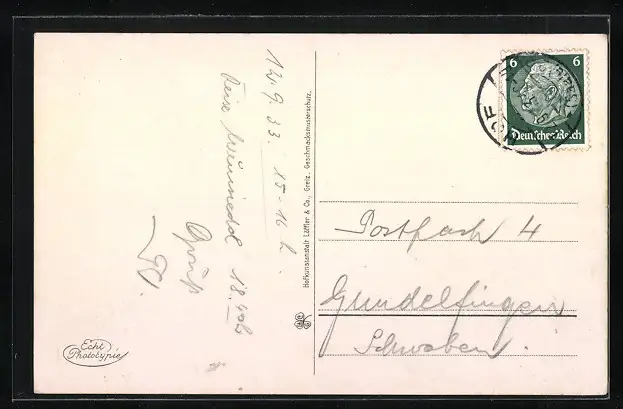 Personenbezogene Daten auf der Rückseite der Karte wurden durch blauen Textmarker unkenntlich gemacht. Die blauen Stellen sind auf die Vorderseite durchgeweicht und wirken sich negativ auf das Postkartenfoto aus