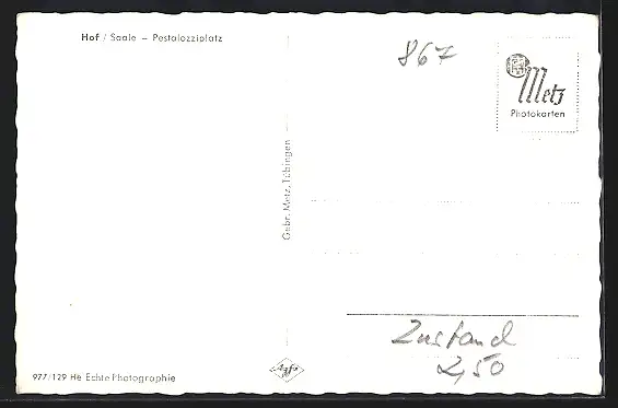 Personenbezogene Daten auf der Rückseite der Karte wurden durch blauen Textmarker unkenntlich gemacht. Die blauen Stellen sind auf die Vorderseite durchgeweicht und wirken sich negativ auf das Postkartenfoto aus
