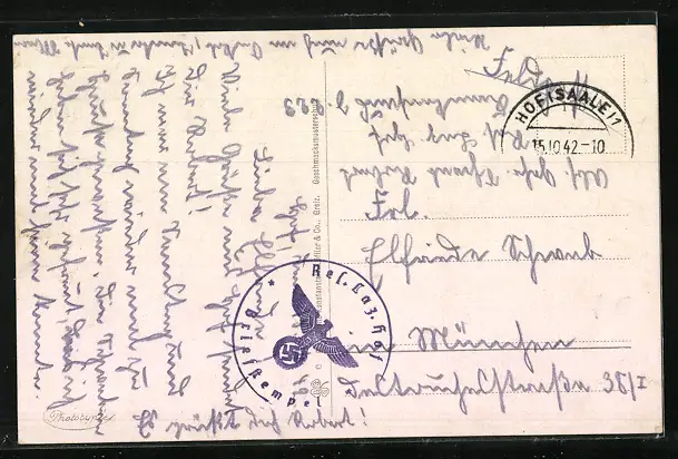 Personenbezogene Daten auf der Rückseite der Karte wurden durch blauen Textmarker unkenntlich gemacht. Die blauen Stellen sind auf die Vorderseite durchgeweicht und wirken sich negativ auf das Postkartenfoto aus