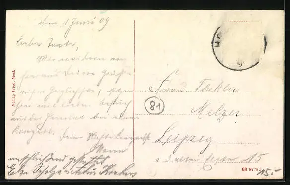alte Ansichtskarte, gelaufen 1909, Briefmarke entfernt, guter Zustand