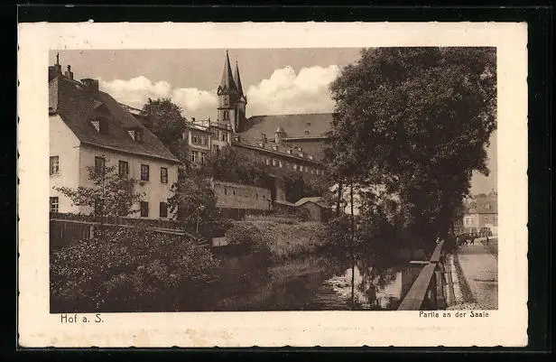 AK Hof a. S., Gebäudepartie am Saaleufer